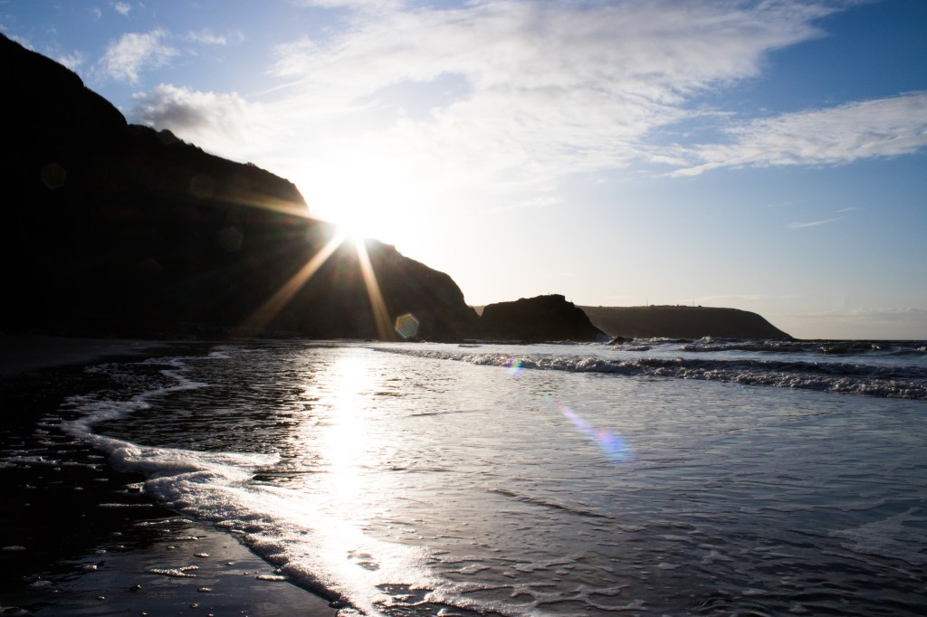 I always get so excited when I step foot onto the sand and this day was no exception. The sun was positioned just behind the cliff and cast a gorgeous golden light over the village. The tide was out just far enough for us to walk around the rocks to see the waterfall and after all the rain that we’d had, it was spectacularly full.