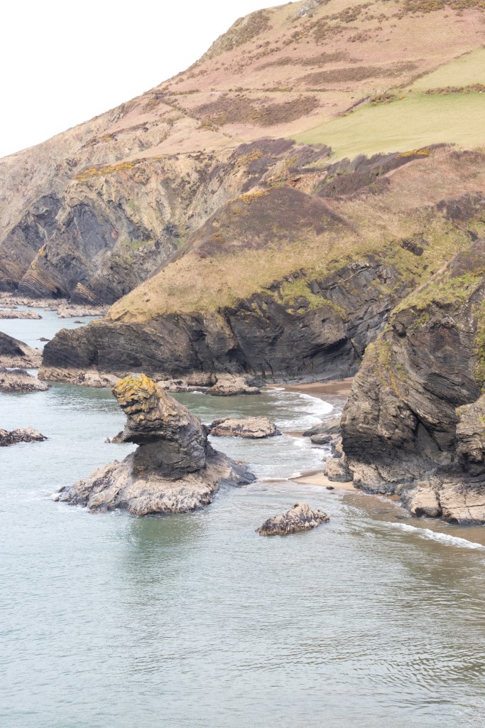 Our last adventure of the week – little did we know it would be our last outing for quite some time – was to Llangrannog. The men had landed back in the UK and so I was expecting them back at some point late afternoon. After spending the morning in my father-in-law’s garden we decided to go out to kill time while waiting for the men to return home. That makes it sound like I didn’t really want to go out but I did – and I’m so glad we did. T and I had a lovely walk on the beach and to the top of the cliff. One my favourite things about the Welsh West coast is all the beachy coves and jagged rocks – something that the area around Aberystwyth seems to be lacking! I had fun photographing the view. Back on the beach, I let T explore the pebbles and the drift wood – he loved it.