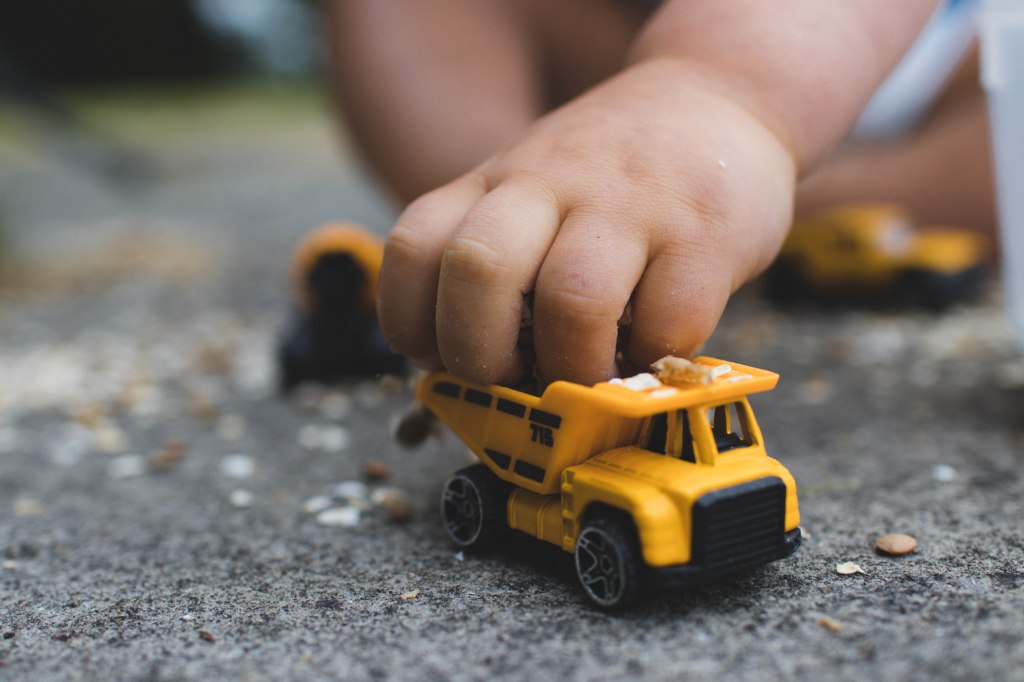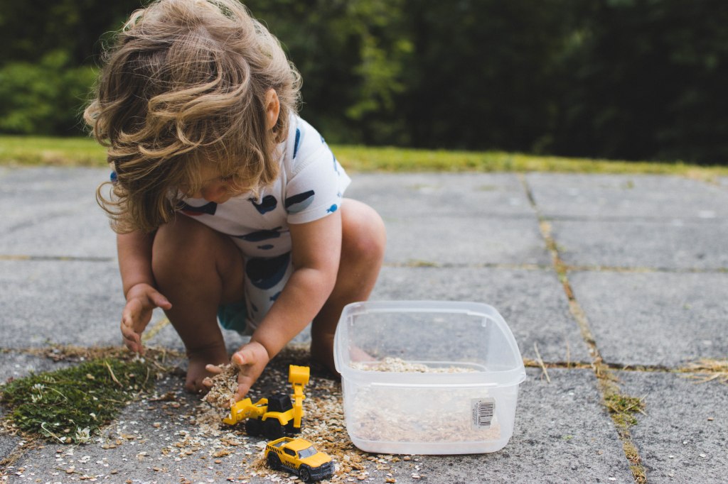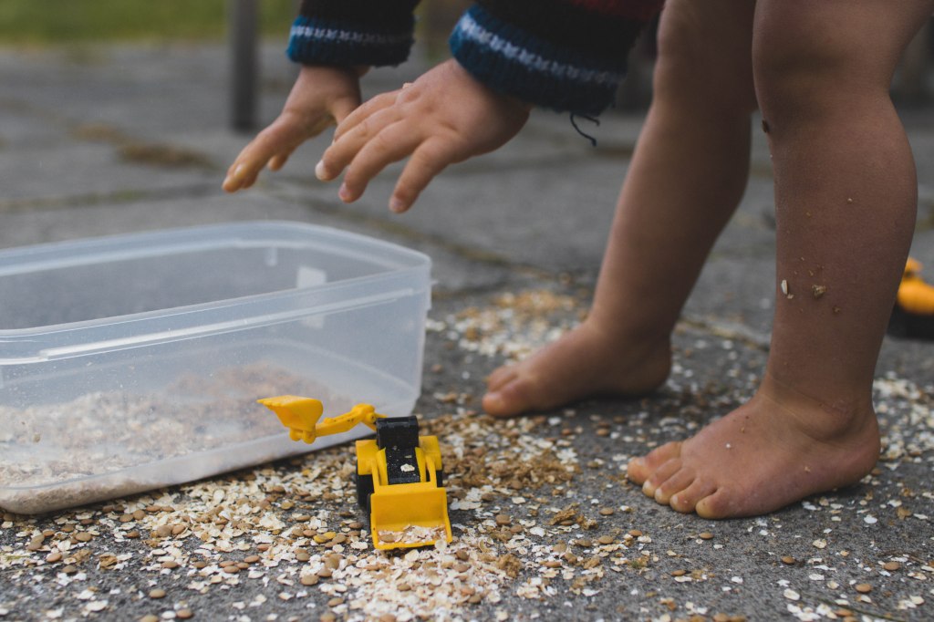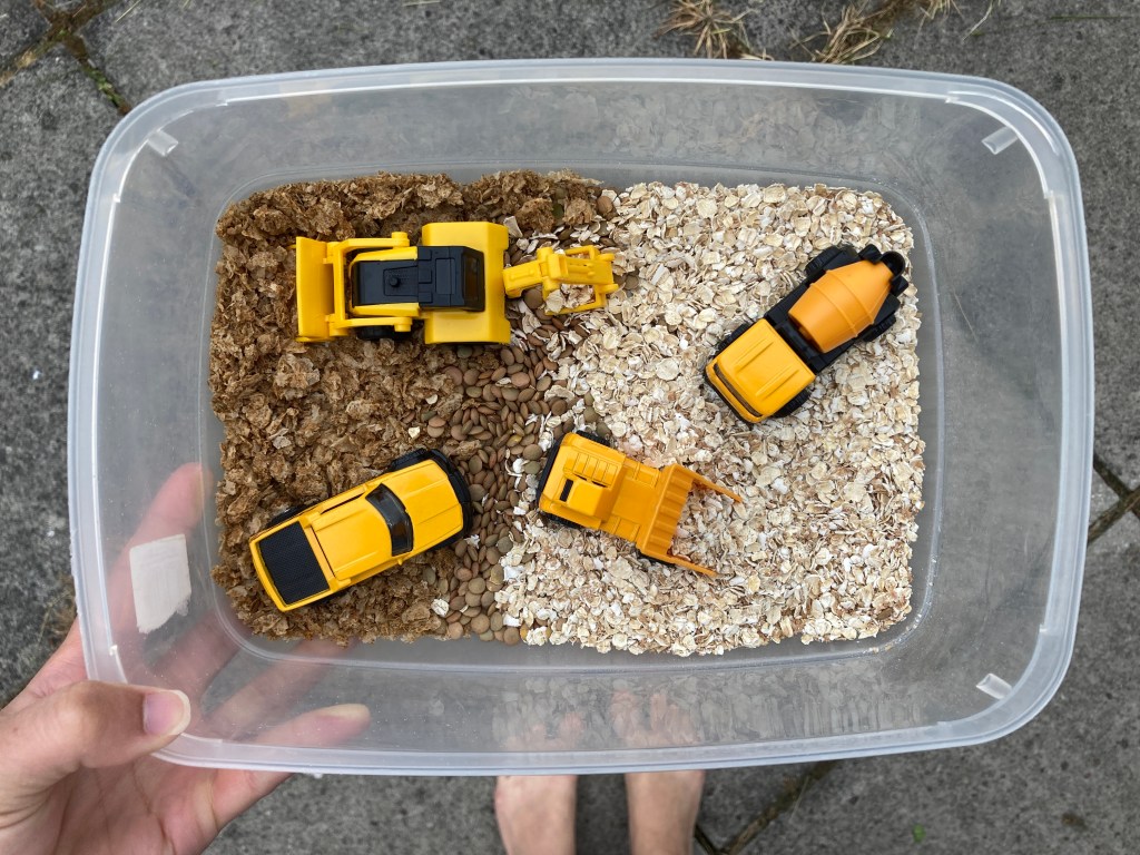 But one Wednesday afternoon when watching Toby play with his diggers and after weeks of thinking he could do with some sand to play with them in, I decided to create a very simple set up using three ingredients from the kitchen cupboard- crushed up weetabix, lentils and oats – and a Tupperware tub.