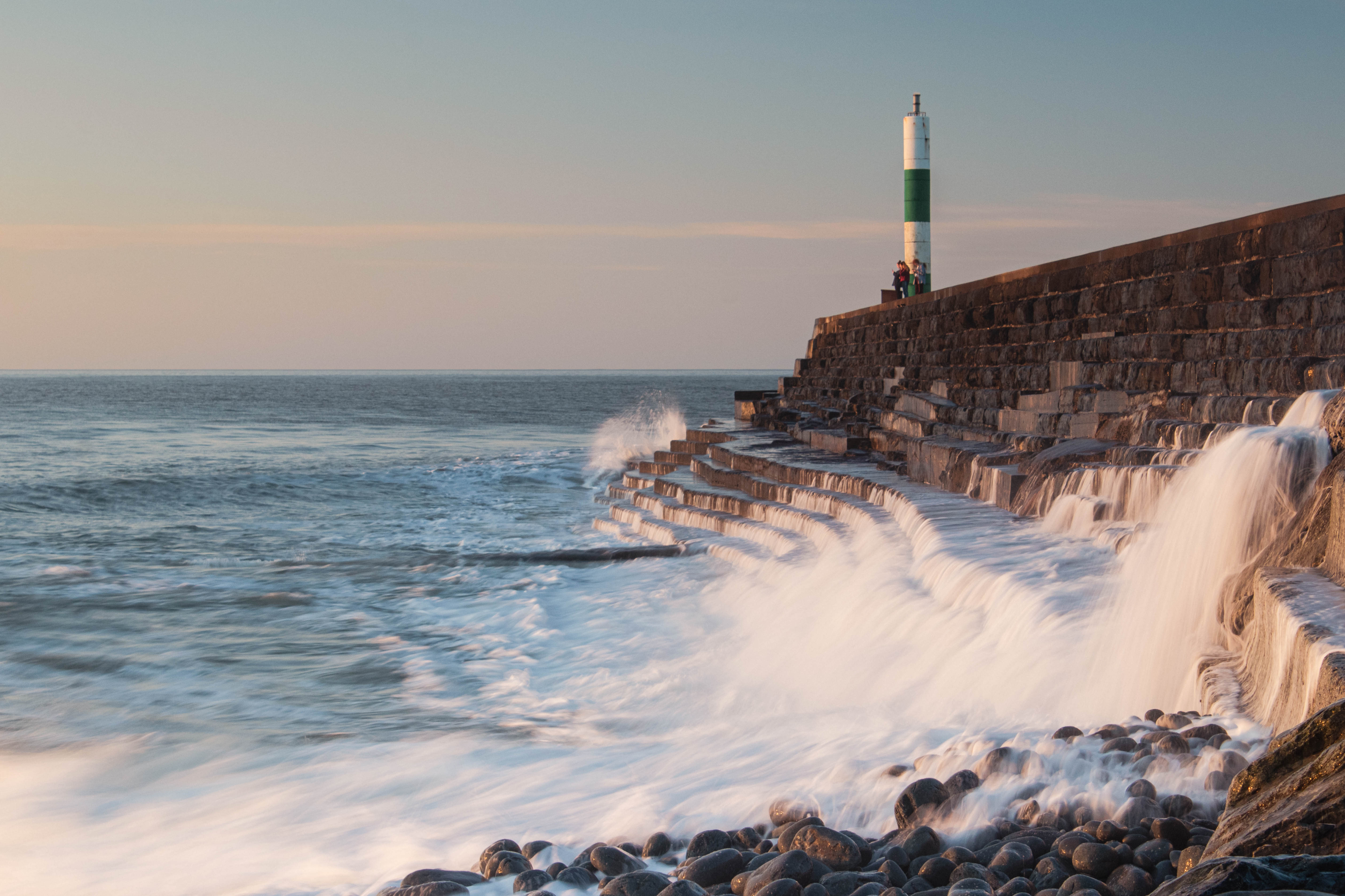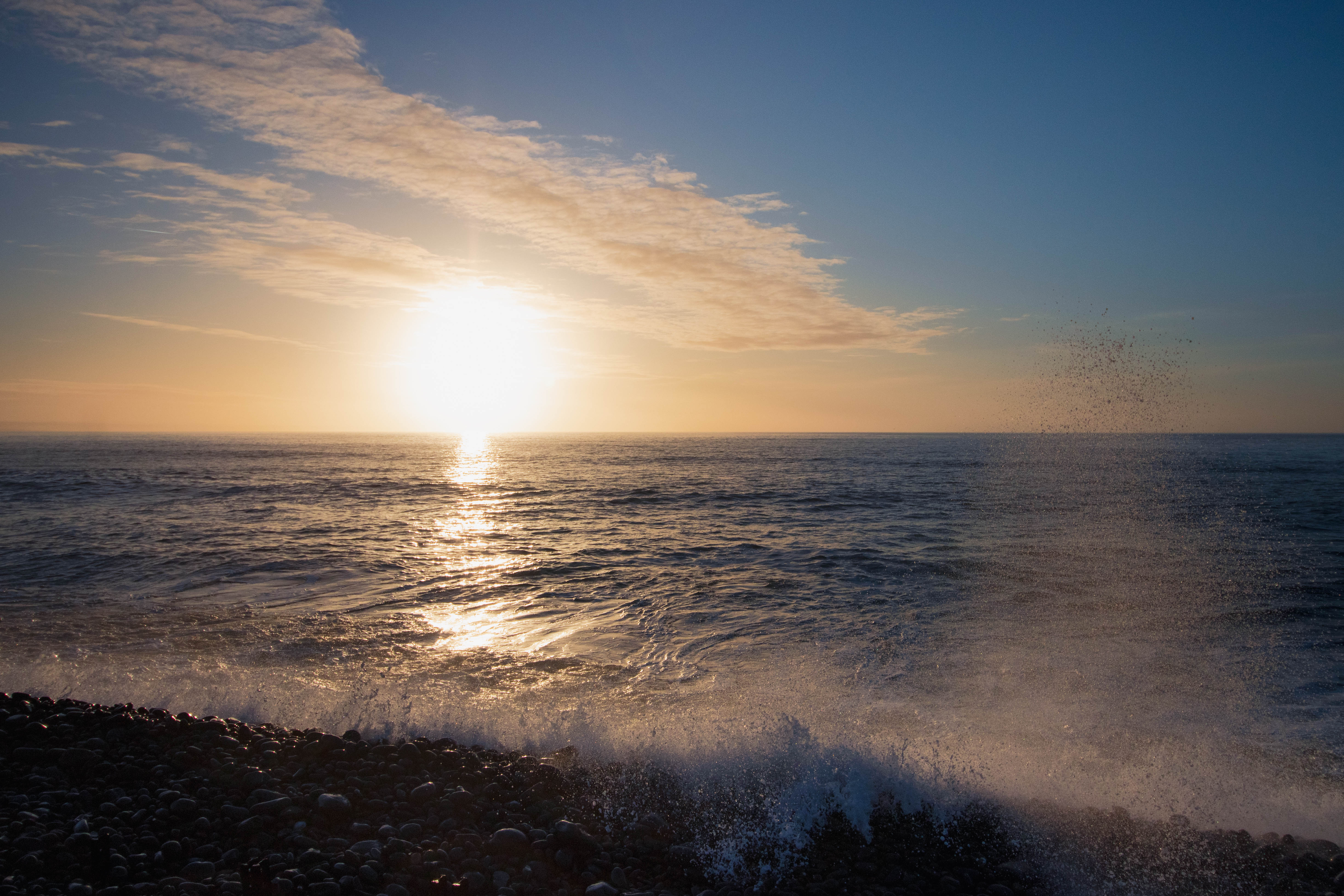 The sound of the sea is thunderous. The sound of rocks rolling into the sea as the waves pull them back in. Large waves rise and fall as they crash on the sea shore.